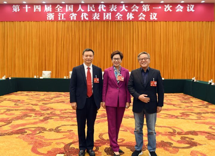 3月5日,鲁伟鼎(右一)、屠红燕(中)、张亚波(左一)在浙江代表团驻地合影屠轶钦摄