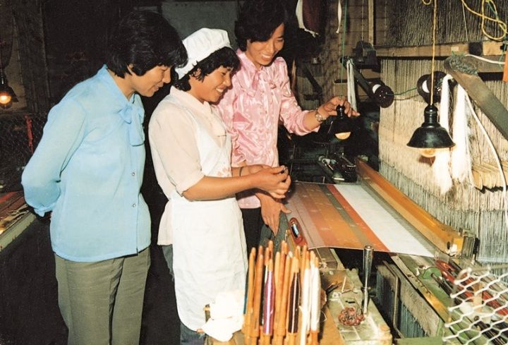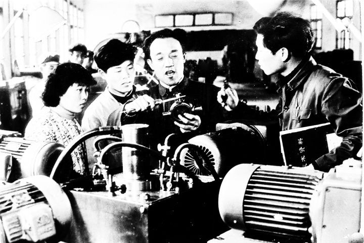 沈爱琴(左一)号召全厂职工都得拜师学艺,自己率先垂范带动职工学技术(资料图片)