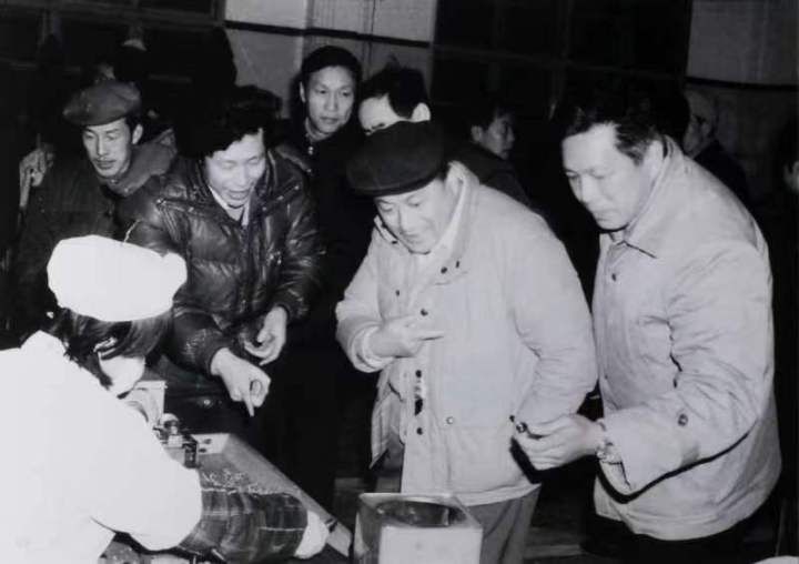 1980年,鲁冠球(右二)深入车间严把质量关 (资料图片)