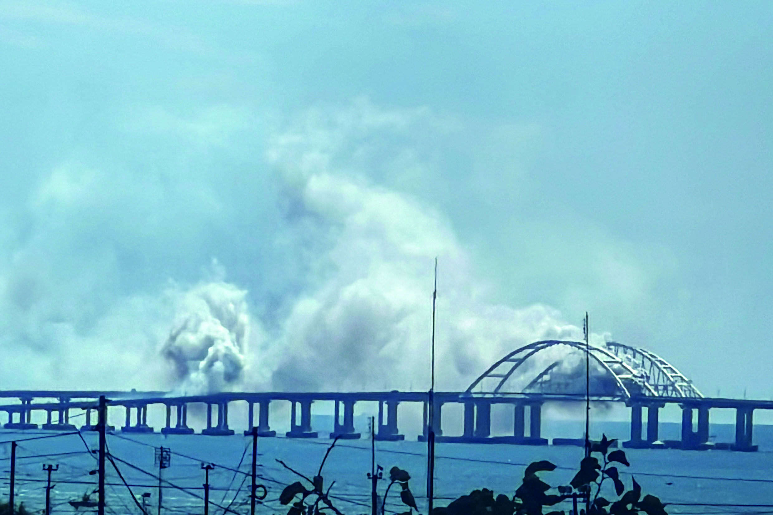 图为8月12日,克里米亚大桥上升起浓浓烟雾。(图片来源:视觉中国)