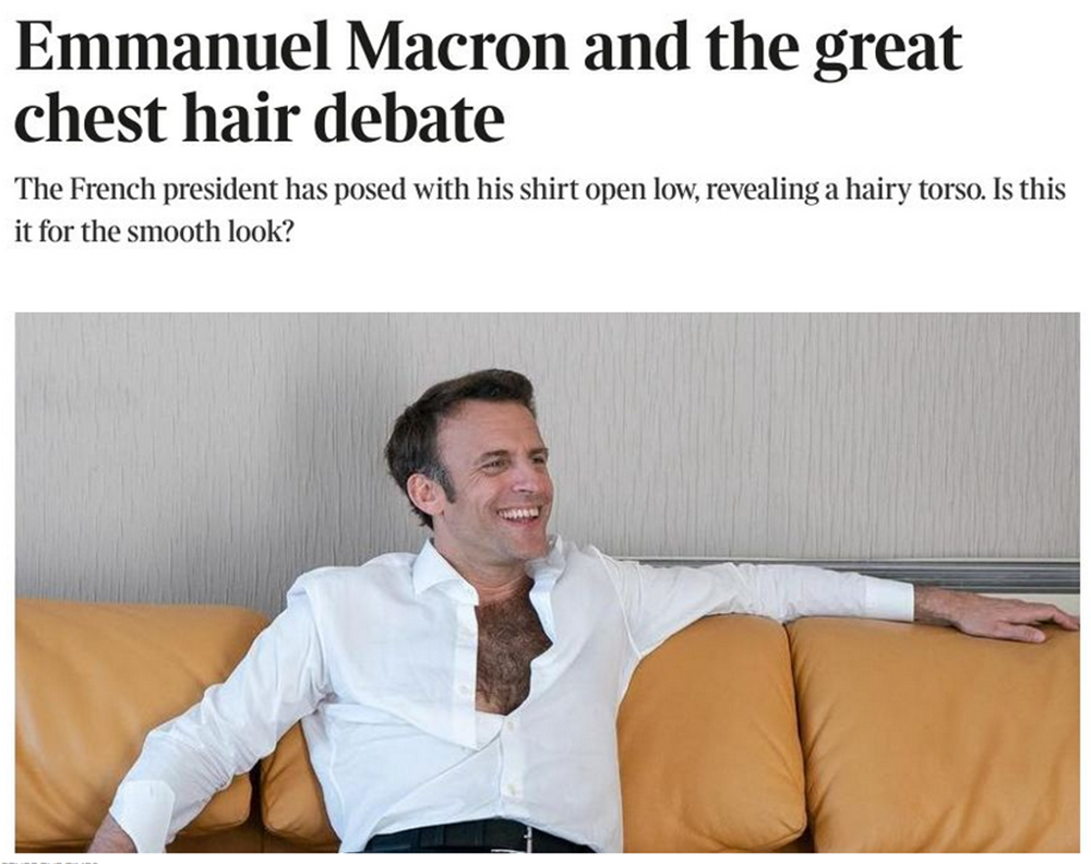 综合法国新闻广播电台(France Info)、《自由南方报》报道,4月17日,马克龙的御用摄影师莫索尼耶(Soazig De La Moissonnière)在社交网络贴出了数张他赴马赛竞选造势的幕后照片。其中一张抓拍照可见到马克龙将白衬衫钮扣解开一半,露出大量浓密深色胸毛,脸上挂著大大的满足笑容,整个人慵懒地躺在浅棕色沙发上。