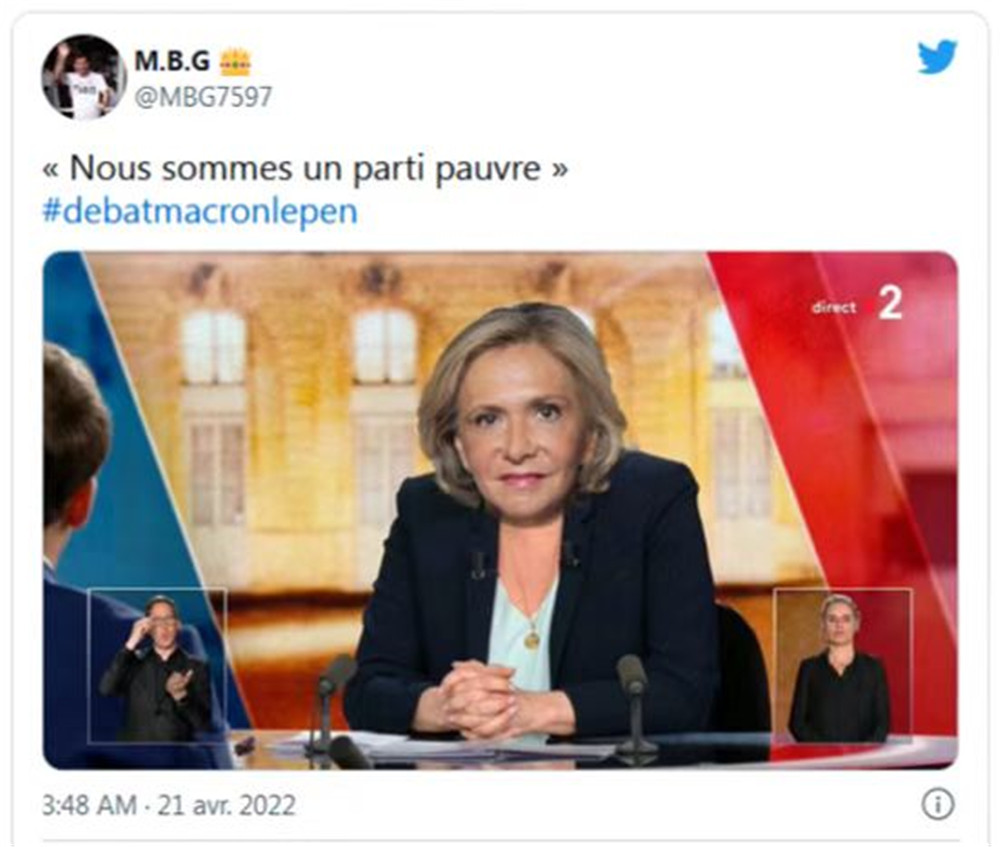 在被问及购买力问题后,两位候选人都提出了他们对欧洲和国际的看法。尽管马克龙指责竞争对手“依赖”俄罗斯和弗拉基米尔·普京(Vladimir Putin),但勒庞拿出了在2014年发布的一条推特上为自己辩护,声称她(支持)一个自由的乌克兰。网民们毫不犹豫地截取这一画面。