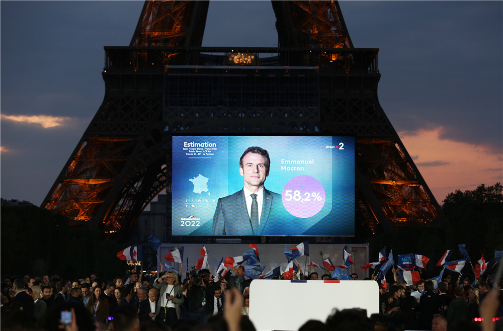4月24日,在法国巴黎,人们参加法国现任总统马克龙的庆祝集会。(图片来源:新华社)