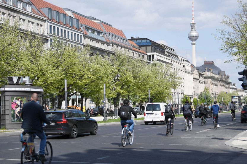 人们在德国柏林菩提树下大街骑行。(图片来源:新华社)