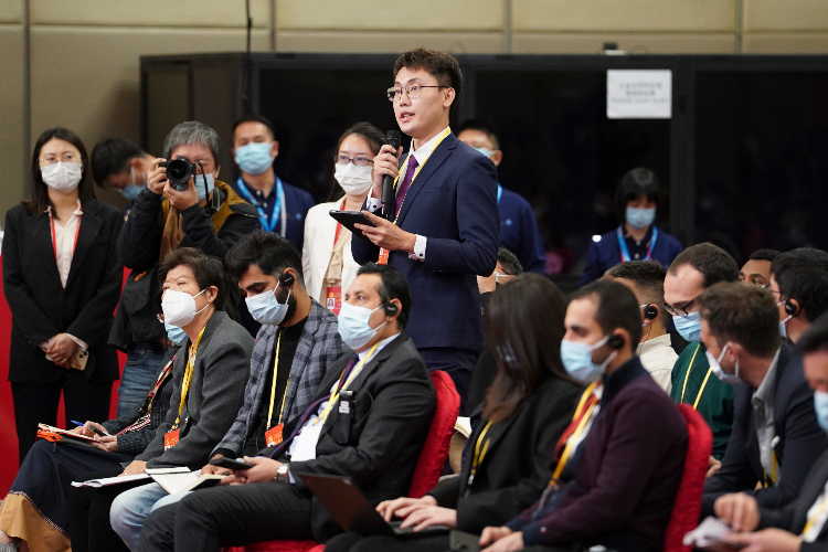 记者在分会场参加记者招待会。(图片来源:中新社)