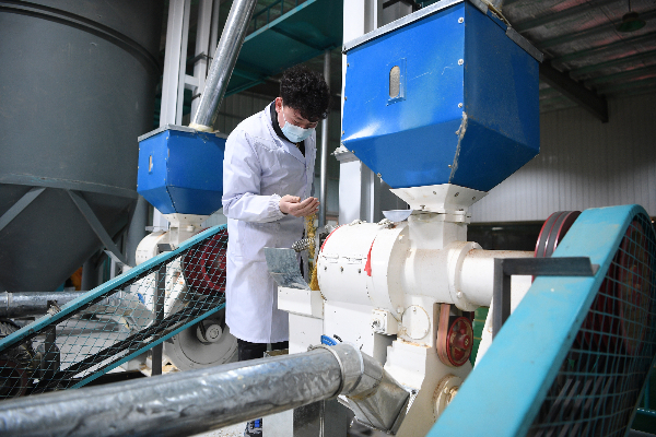 2022年2月28日,在福建资金帮扶下建成的宁夏中卫市海原县贾塘乡锦彩生态农业公司,工人在检查小杂粮生产情况。