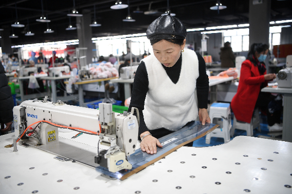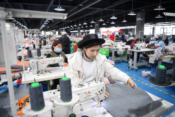 2022年2月28日,工人在宁夏中卫市海原县闽宁科技园制作成衣产品。