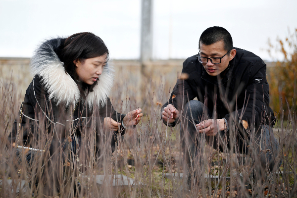 2022年1月29日,来自福建厦门的植物研究员郑国华(右)在宁夏泾源县查看冬季植物生长情况。
