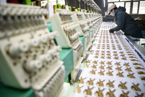 2022年2月28日,工人在宁夏中卫市海原县闽宁科技园制作成衣标识。