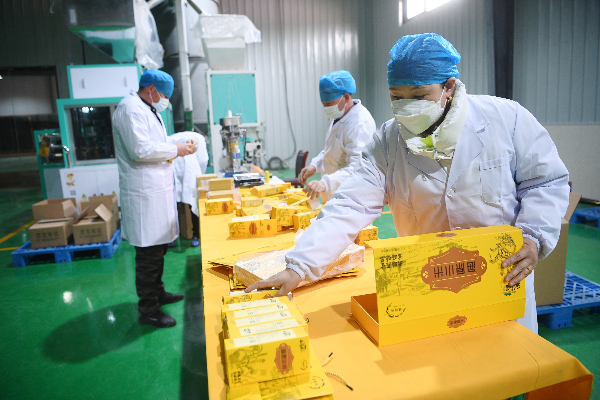 2022年2月28日,在福建资金帮扶下建成的宁夏中卫市海原县贾塘乡锦彩生态农业公司,工人在包装小杂粮产品。
