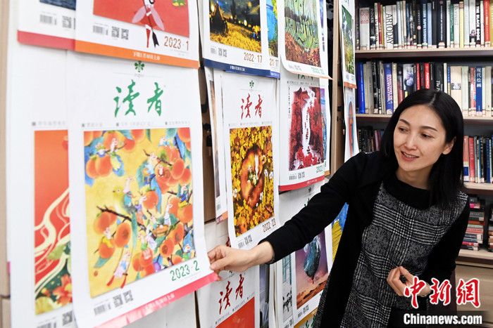 2月20日,陈天竺介绍《读者》杂志往期封面。(图片来源:中新网)