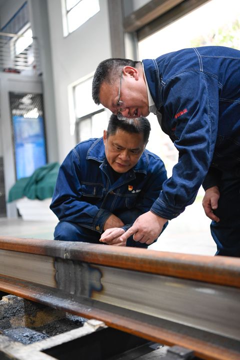 2月21日,邹明(右)与同事观察轨道焊接实验中的焊缝情况。(图片来源:本文图片均自新华社)
