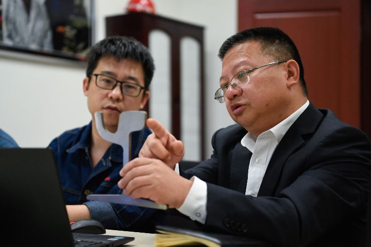 2月21日,在攀钢集团研究院,邹明(右)与同事一起讨论道岔设计方案。