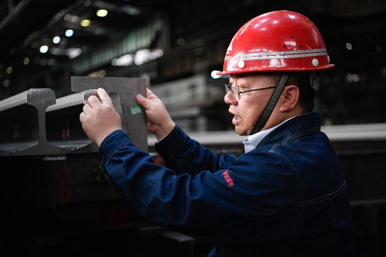 2月21日,邹明在鞍钢集团攀钢攀枝花钢钒有限公司轨梁厂检查成型钢轨表面情况。