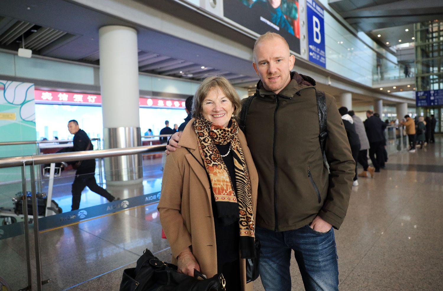 2023年12月1日,在华生活的德国人肯(Ken,右)与搭乘CA934航班抵达北京的母亲克里斯(Chris),在北京首都国际机场国际航班出口处留影。 (图片来源:欧洲时报特约记者卞戈 摄)