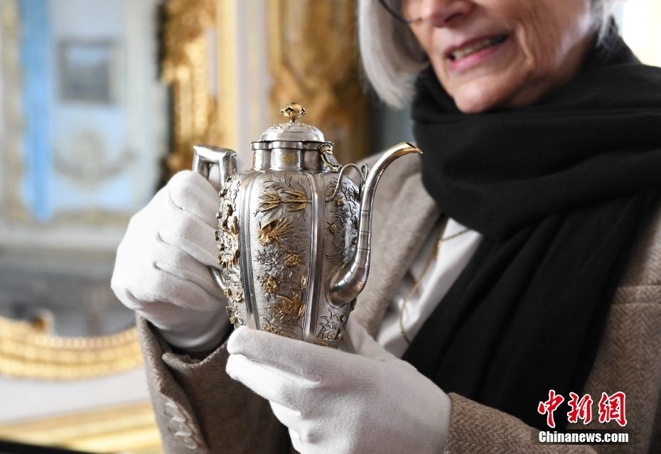 1月29日,法国凡尔赛宫召开新闻发布会,向记者披露中法建交60周年赴华活动的细节。图为将在“凡尔赛宫与紫禁城:17、18世纪的中法交往”展览中展出的1686年暹罗使节进献给路易十四的中式壶——“花鸟纹雕银部分镀金水壶”。(图片来源:中新社)