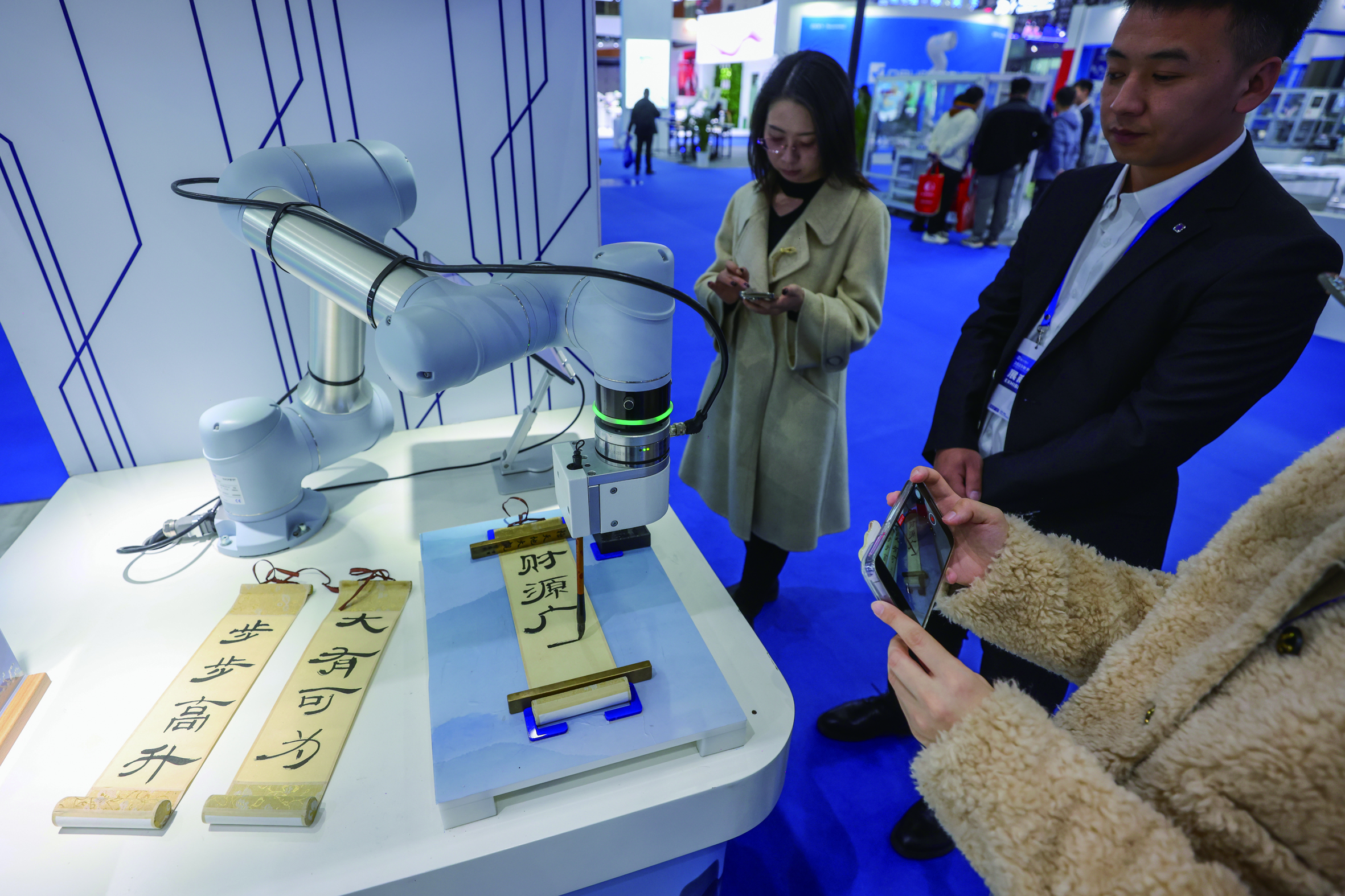 图为智能机器人书法家在2023世界智能制造大会上现场“挥毫”。(图片来源:中新社)