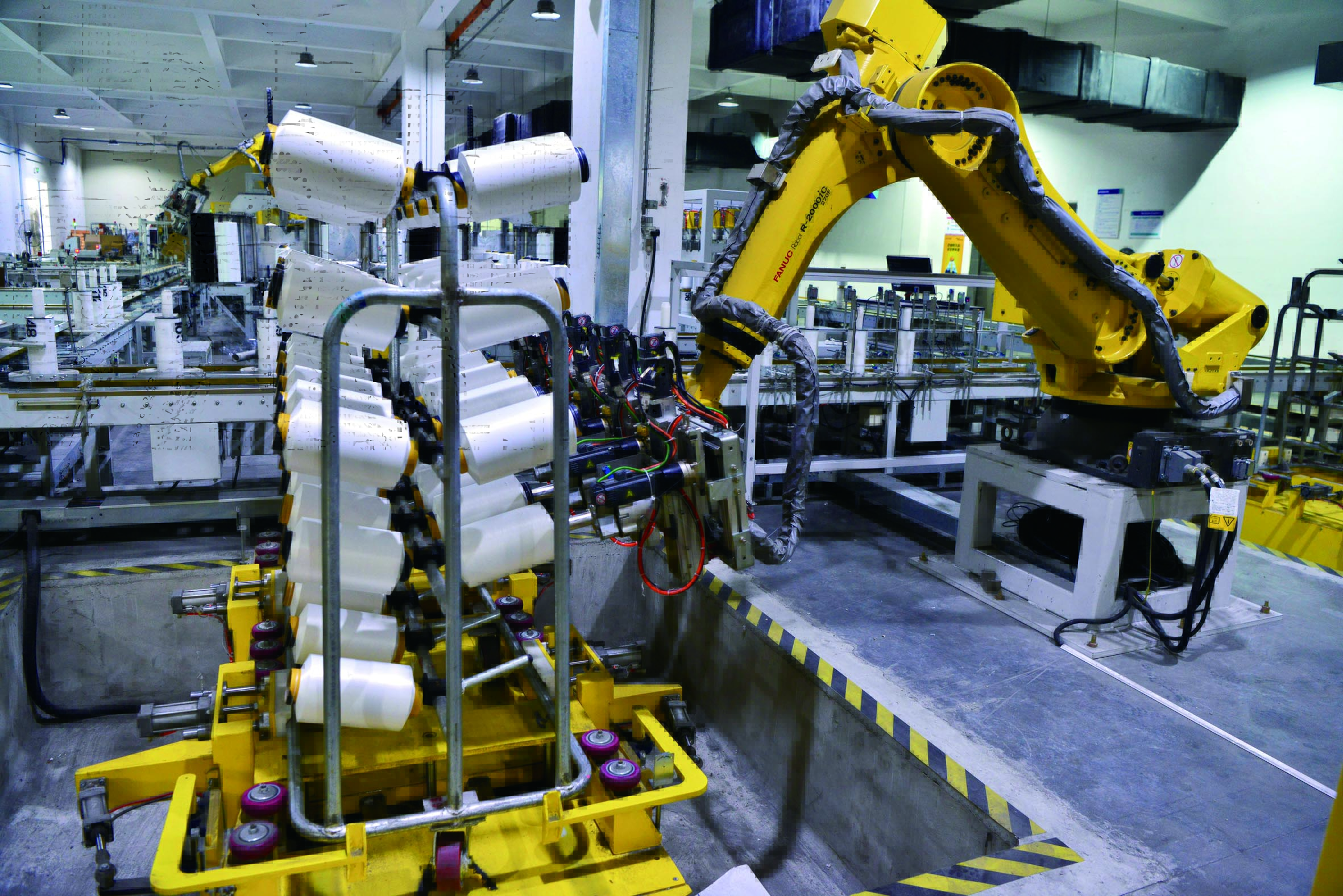 图为在福建省福州市长乐区一家化纤纺织企业智能车间内,机器人在生产线上作业。(图片来源:中新社)