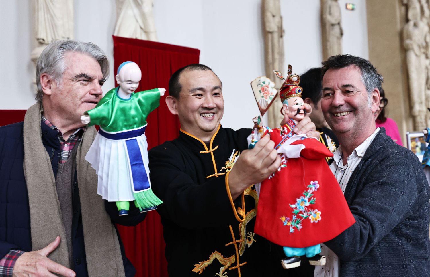 2月10日,在位于巴黎埃菲尔铁塔附近的建筑与遗产之城博物馆,观众体验布袋木偶戏。(图片来源:新华社)