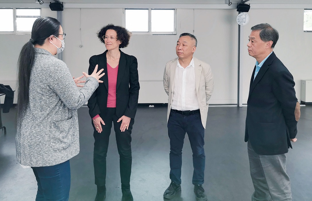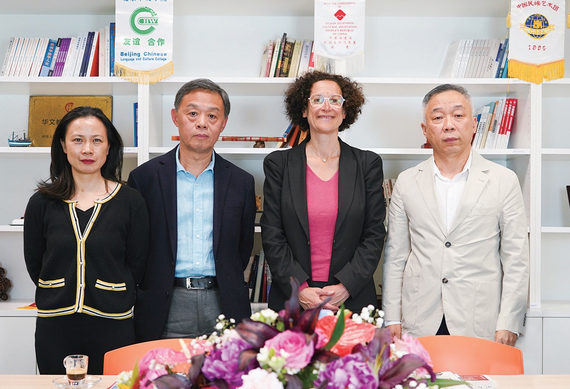 前法国住房部长瓦贡(右二)在欧洲时报常务副社长钟诚(右一)、欧洲时报总编梁扬(左二)和前法国驻武汉总领事馆经济领事黄勤(左一)的陪同下参观欧时文化中心,并详细了解集团的文化与教育服务业务。潘越平摄