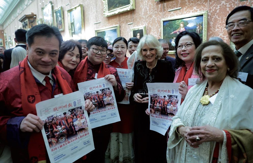 《欧洲时报》英国版副主编严振羽带着头版印有查尔斯和卡米拉2022年春节访问伦敦华埠报道的报纸和“欢乐春节”吉祥物生肖兔,受邀出席招待会。她分别向国王查尔斯、皇后卡米拉、安妮长公主等皇室成员介绍了《欧洲时报》概况,查尔斯和卡米拉愉快回忆起去年在唐人街参加新春庆典、参观华埠的经历,并为欧洲时报和中文媒体在沟通英国和华人社区的作用和贡献点赞。卡米拉也饶有兴致地向严振羽和华人嘉宾们了解生肖兔的意义,并祝大家农历新年快乐。