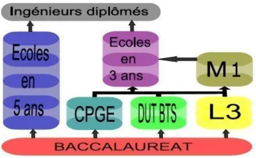 除预科之外,还有其他办法可以进入工程师院校,比如通过先就读BTS(高级技师证书)、DUT(大学技术文凭)、Licence2(本科2年级)等,拿到认证为Bac+2(本科二年级)的文凭,之后也可以参加考试(concours),这一方法相对而言难度更大。但这一方法的好处是即使考试失利,也可以选择复读一年,或者转向攻读公立大学、其他工程师院校和商学院等。