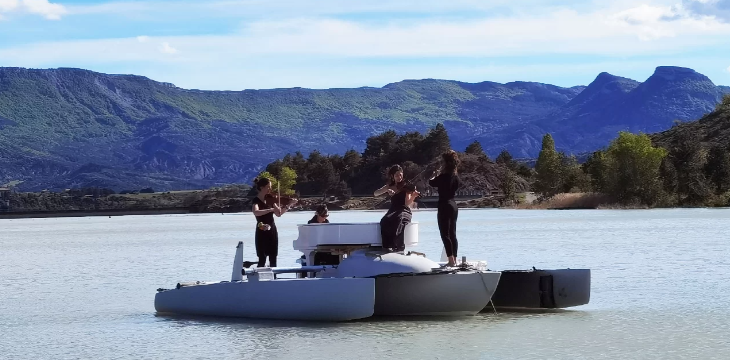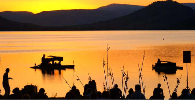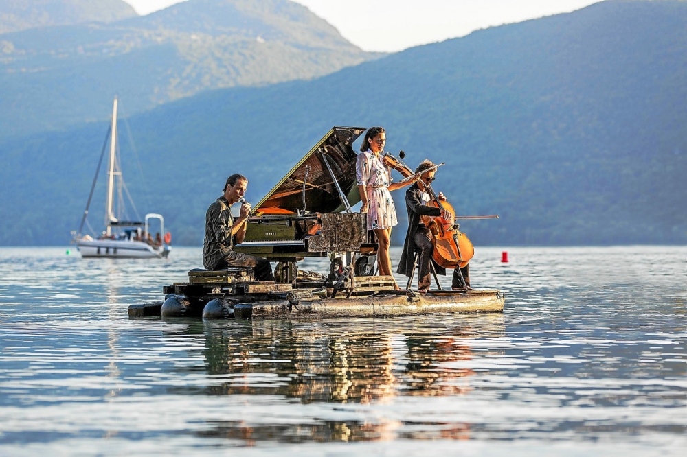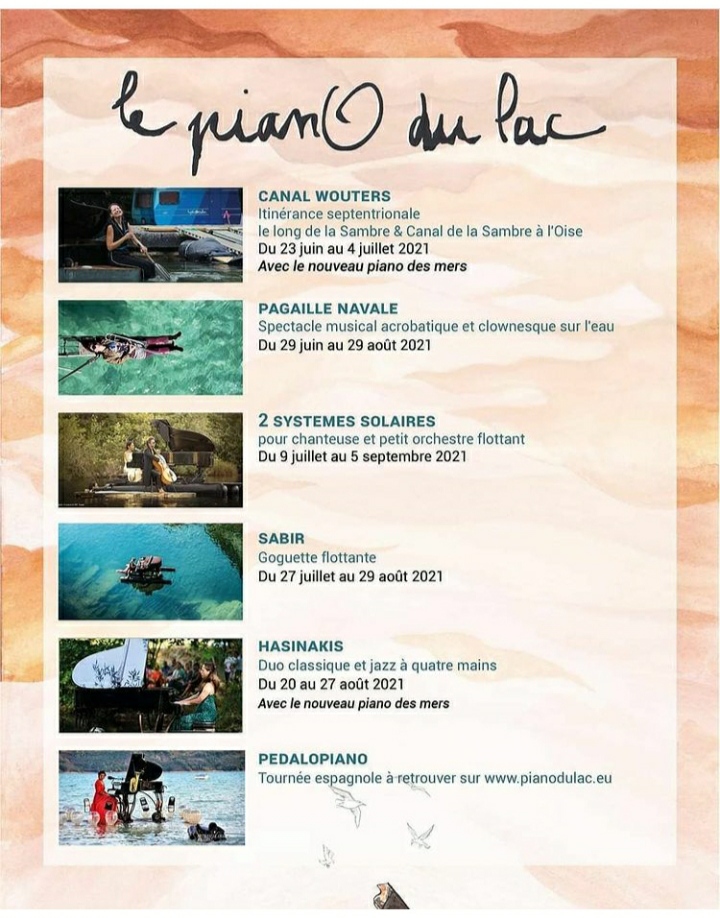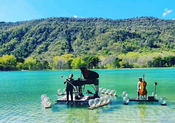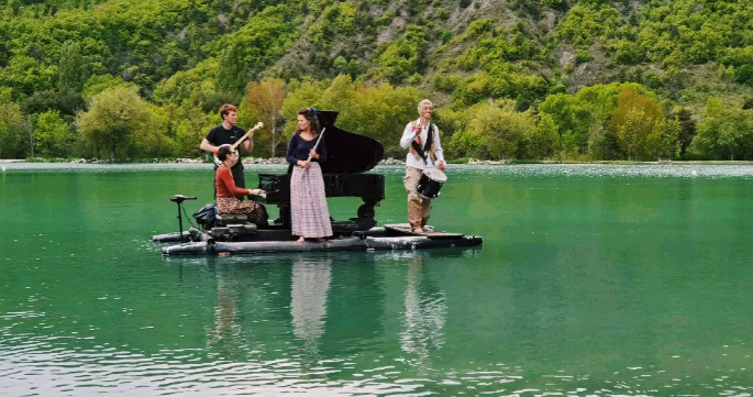 湖心钢琴(le pianO du lac)从2014年的夏天开始,在法国各大静谧绝美的湖泊中心展开为期两到三个月的巡回演出。这支由多位欧洲钢琴家、小提琴家、大提琴家、长笛演奏家、歌唱家等音乐家们共同组成的团队,在湖泊与河流之间辗转,一年年为听众呈现了一个极其特别的舞台,让大家身临其境,感受到水域和音乐完美交织的诗意氛围。