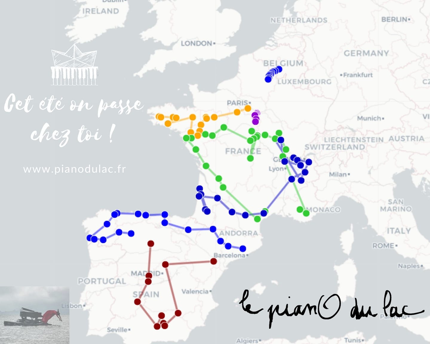 2020年,湖心钢琴(“le pianO du lac“)的音乐家们兵分四路、在法国和西班牙沿着4条路线进行演出,累计演出160多场音乐会,共有48029人次在现场观看演出。今年又新增了两条路线、共有6场风格各异的巡演即将与大家见面,具体日程安排如下方海报所示~