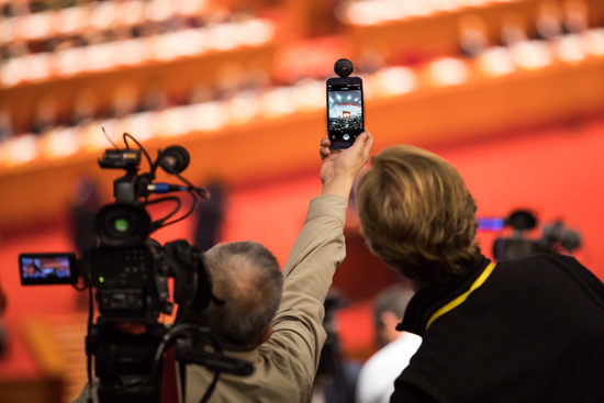 北京时间10月18日上午,中国共产党第十九次全国代表大会在北京人民大会堂开幕,图为两位外媒记者用手机拍摄会场。(图片来源:欧洲时报特约记者李雪峰 摄)