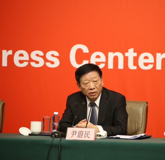 尹蔚民在回答记者提问。(图片来源:欧洲时报特派记者孔帆 摄)