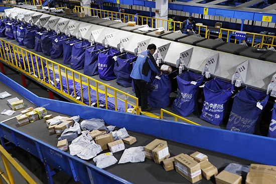 11月11日晚上18时30分,在中通快递上海转运中心内,自动分拣系统正在对快递包裹进行分类处理。(图片来源:中新社)