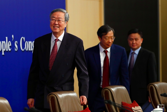 3月9日,十三届全国人大一次会议在北京举行记者会,周小川、易纲等人回答中外记者问。(图片来源:中新社)