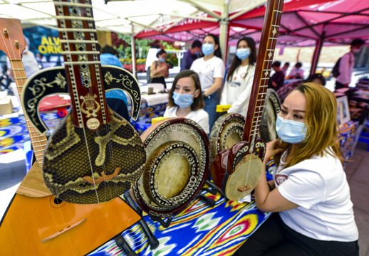 6月12日,“文物赋彩全民小康 非遗传承健康生活”文化和自然遗产日推介活动在乌鲁木齐市国际大巴扎举行。(图片来源:中新社)