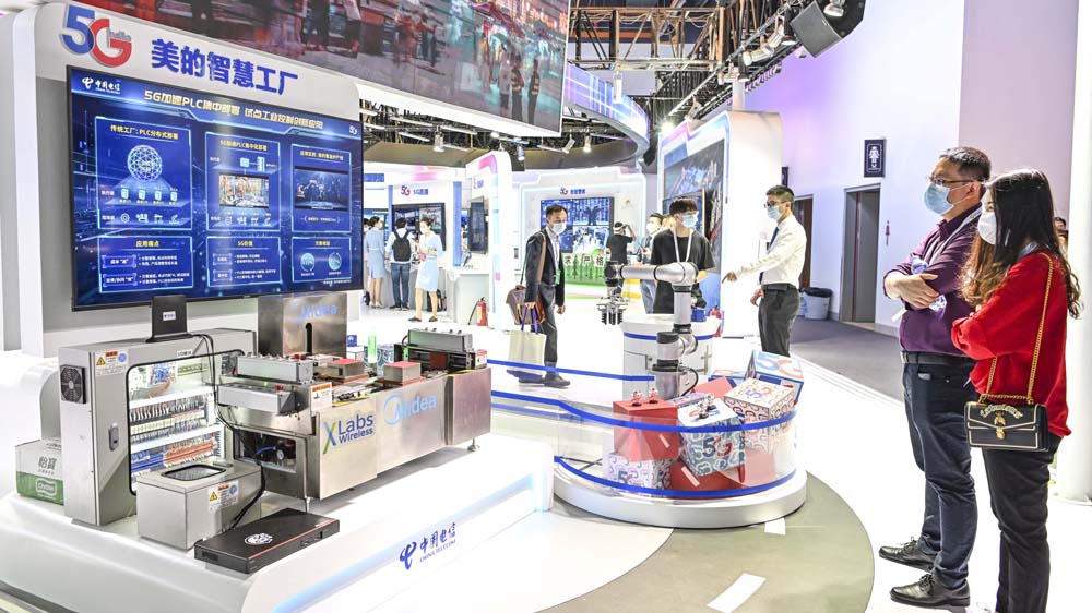 图为观众在展会区参观5G智慧工厂模型。(图片来源:中新社)