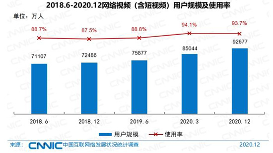 截至2020年12月,中国网络视频用户规模达9.27亿,较2020年3月增长7633万,占网民整体的93.7%。其中,短视频用户规模为8.73亿,较2020年3月增长1.00亿,占网民整体的88.3%。