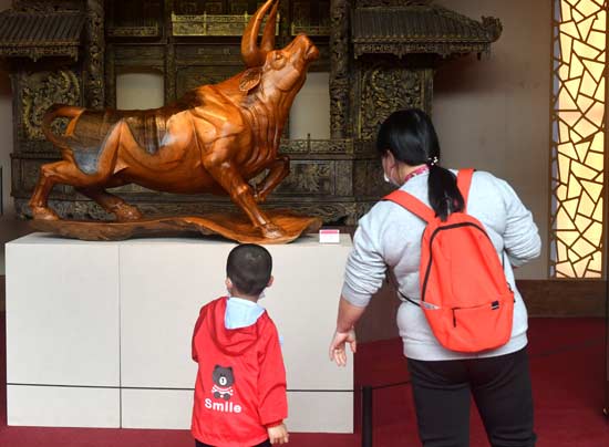 2月6日,福建福州,“辛丑新春主题非遗作品展”正在福建省非物质文化遗产博览苑展出。展览以“牛”为主题,用非遗视角艺术性地展现牛文化。展品涵盖寿山石雕、剪纸、德化瓷、雕塑、篆刻等多种形式。