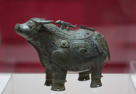 上海博物馆藏商代晚期文物青铜器“凤纹牺觥”。(图片来源:新华社)