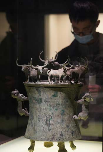 观众在上海博物馆参观西汉时期的青铜器“八牛贮贝器”。(图片来源:新华社)