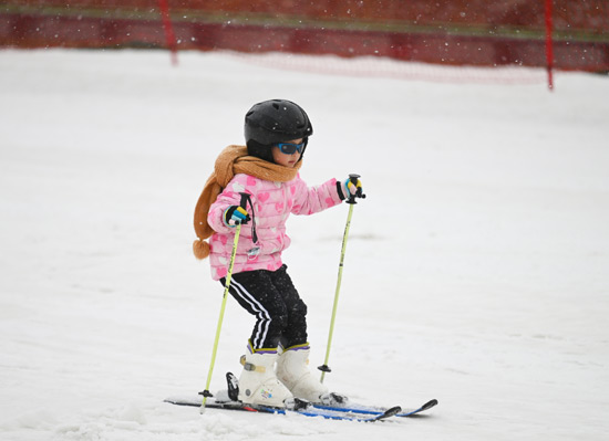 2月14日,一名小朋友在北京八达岭滑雪场滑雪。