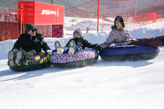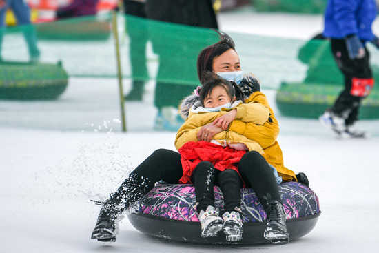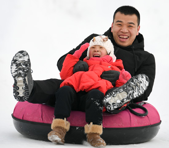 2月15日,市民带着孩子在内蒙古呼和浩特市东河戏雪乐园内滑雪圈。