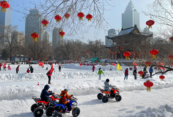 2月15日,在乌鲁木齐人民公园内,市民体验冰雪娱乐项目。