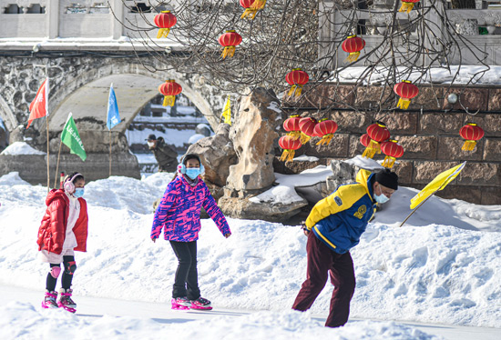 2月15日,在乌鲁木齐人民公园内,市民在滑冰。