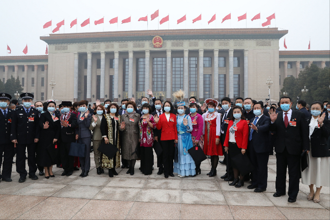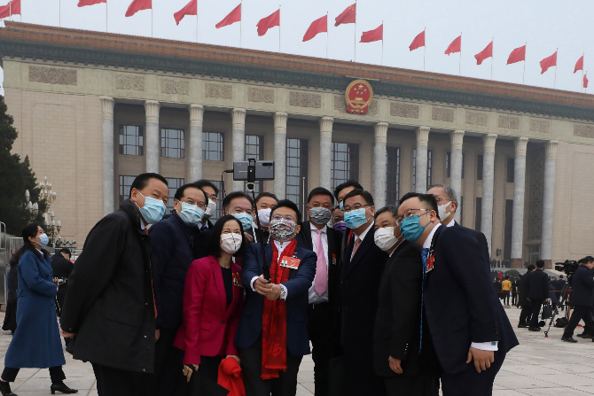 来自香港特别行政区的全国人大代表在大会堂前自拍。