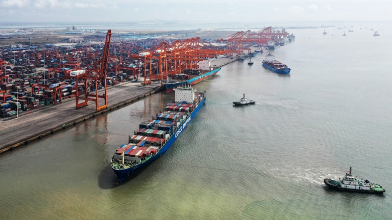 资料图为繁忙的钦州港码头。(图片来源:新华社)