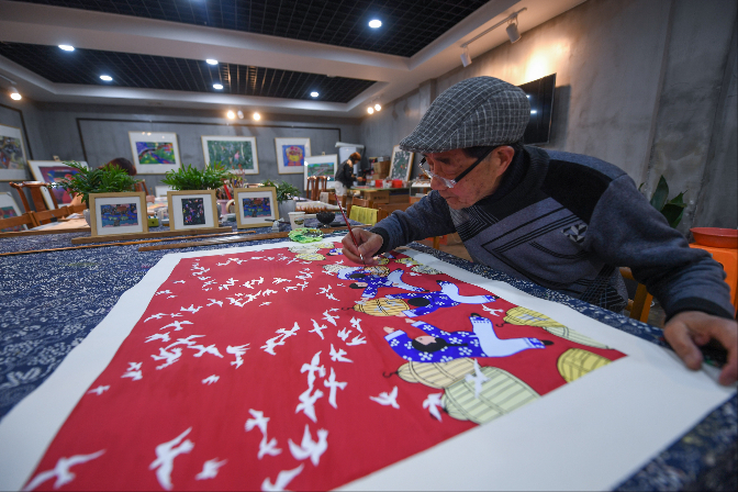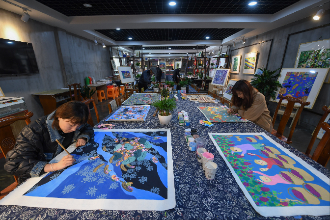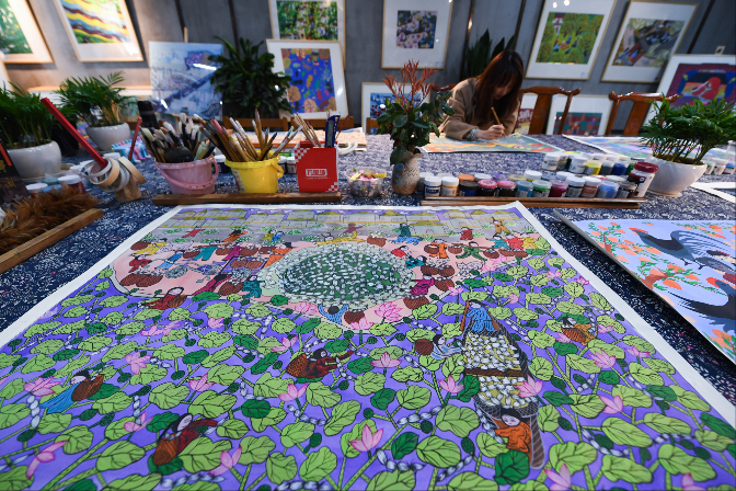 农民画创作者在创作特色农民画。