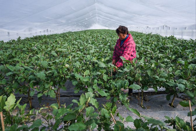 在嘉善县姚庄镇现代农业小微产业园的大棚内,农民在查看茄子长势。该产业园引入第三方管理,服务本地及周边小微农户、合作社、青年创业者等群体。目前,产业园有大棚面积约900亩,形成了以茄子种植为主的种植模式,产品主要销往长三角地区。