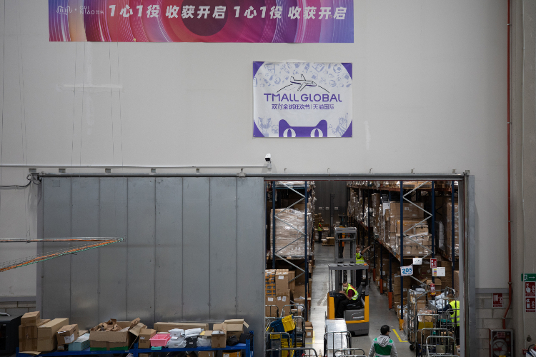 2020年11月11日,工作人员在西班牙瓜达拉哈拉市的菜鸟海外仓分拣商品。(图片来源:新华社)
