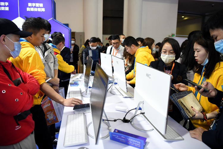 采购商在一家3C产品展位前了解展出商品。(图片来源:新华社)