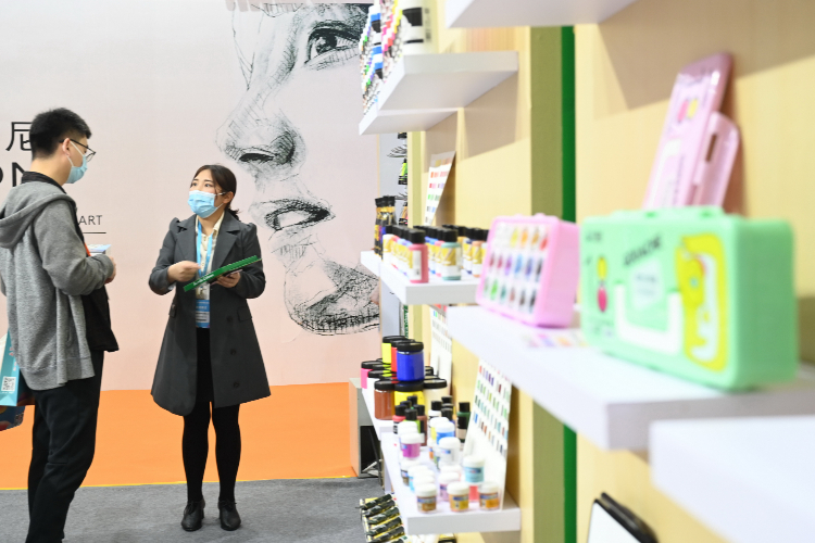 3月18日,在中国跨境电商交易会上,一家文化用品展位的工作人员(右)在向参观者介绍文化用品。(图片来源:新华社)