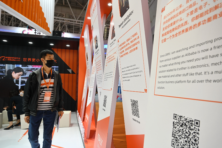 与会者在阿里巴巴国际站展位参观。(图片来源:新华社)